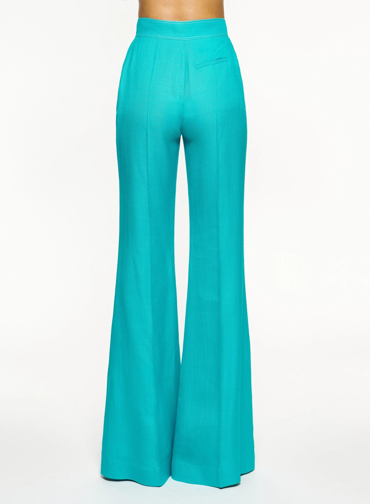High rise, flared pants in Blue Gin linen are a summer essential. Pair with the matching vest for a casual-chic monochromatic look.