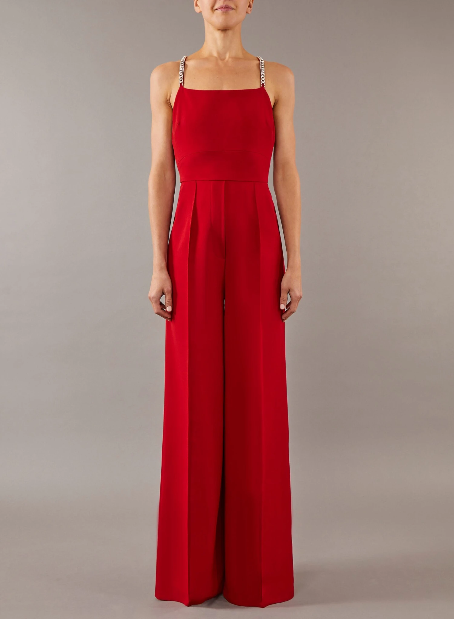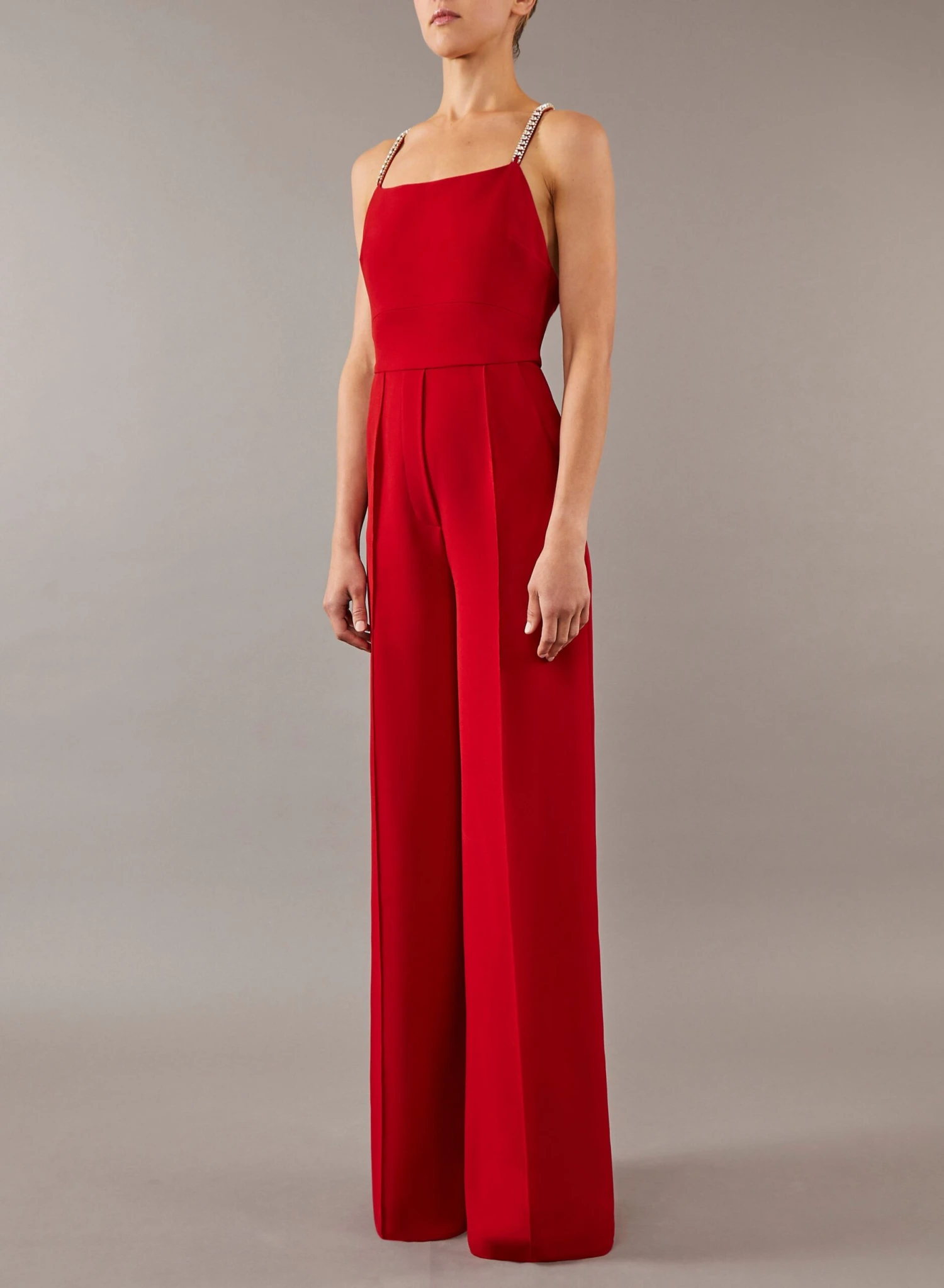 An elegant piece in cardinal red, this wide-legged crepe cady jumpsuit features crystal chains around the straight neckline and the monogram cross back-straps for a touch of radiance.