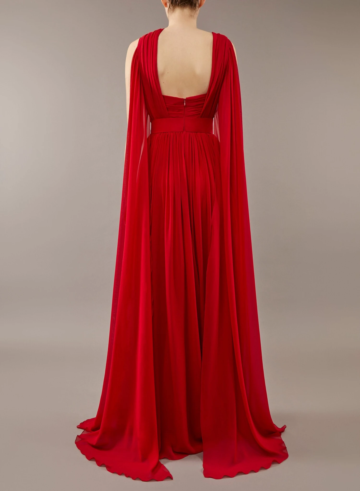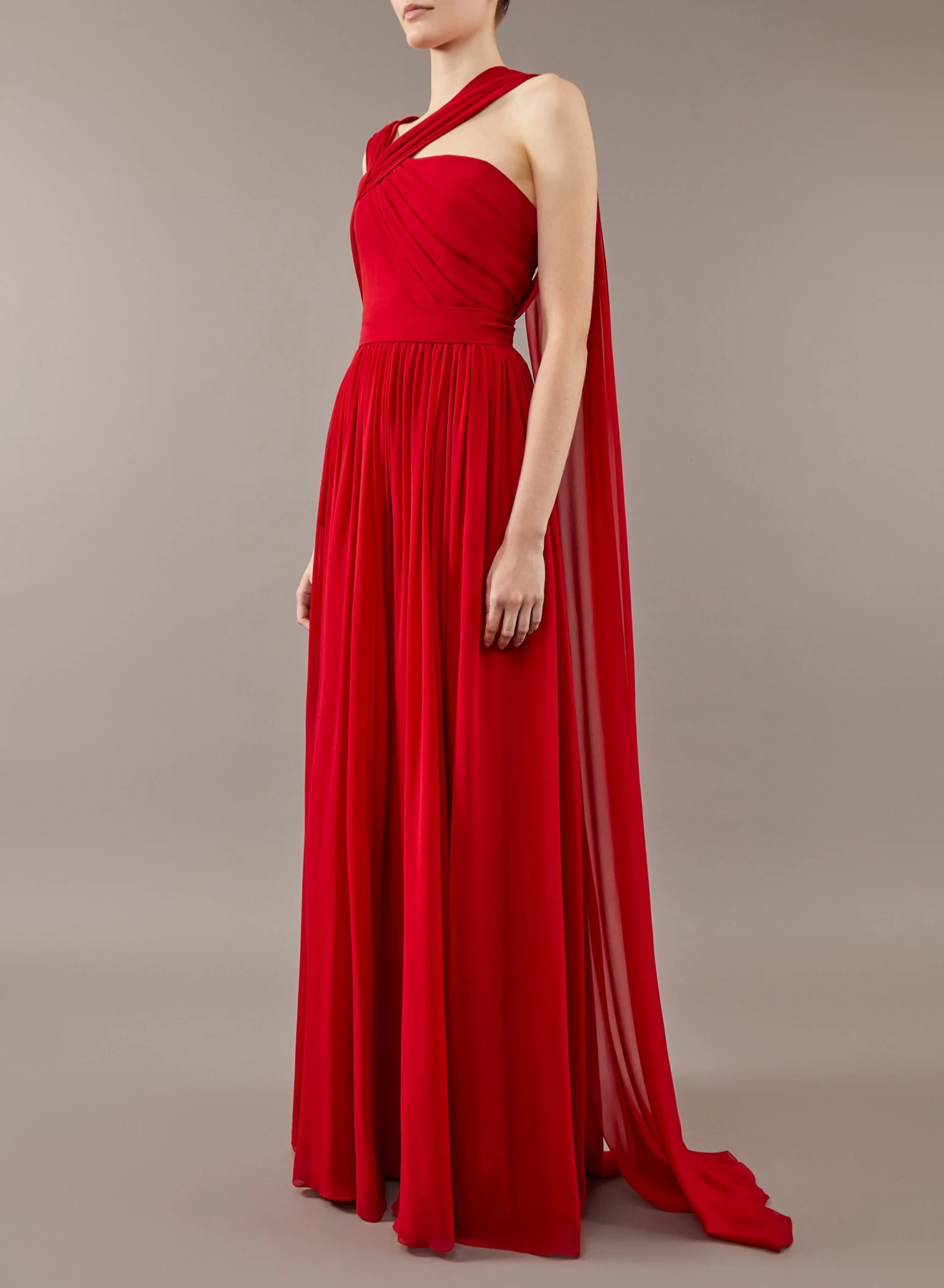 This long flowing dress with an asymmetrical neckline is emboldened in cardinal red silk chiffon. A draped bodice and cinched waist make this airy silhouette quintessentially ELIE SAAB.