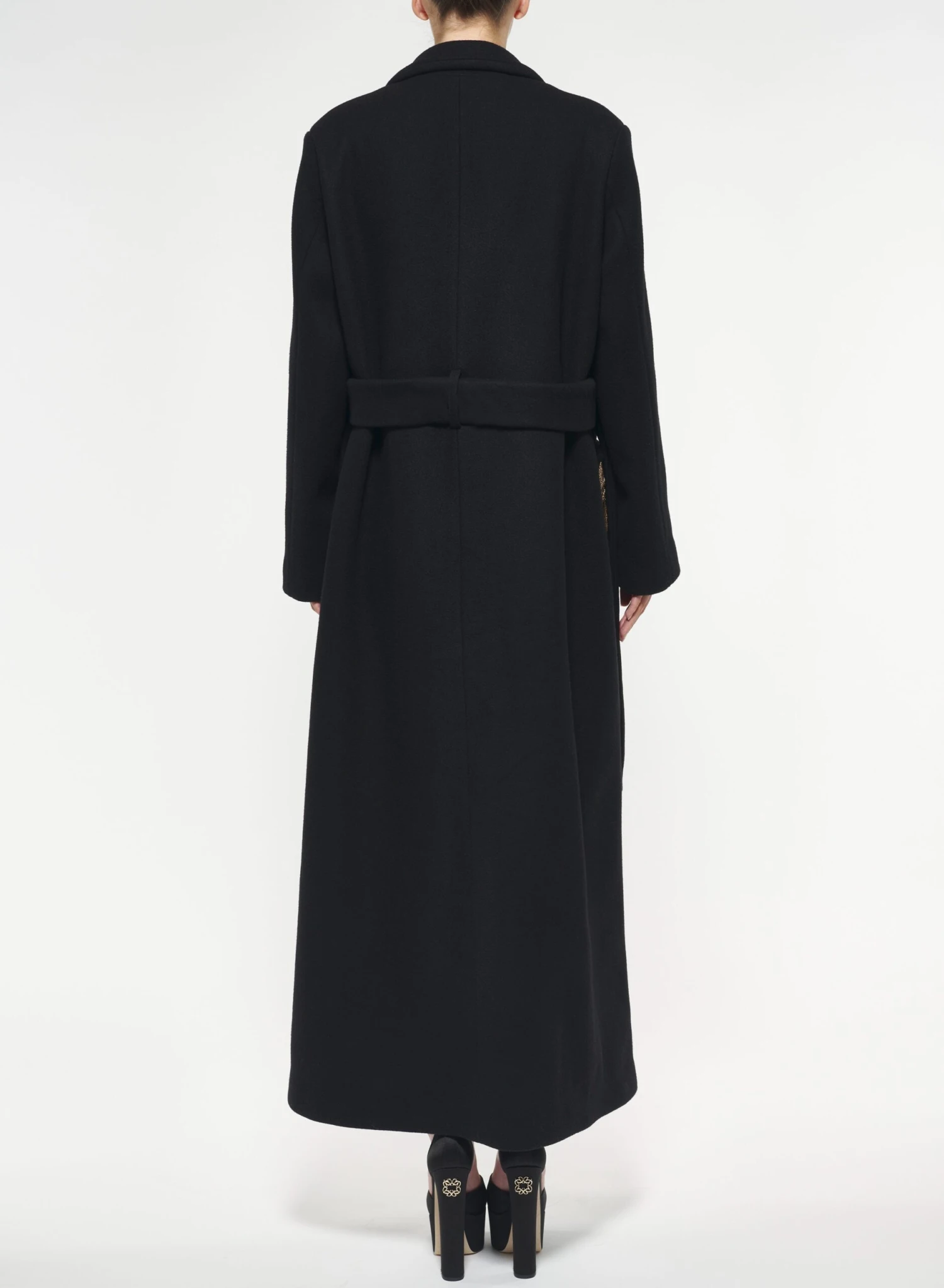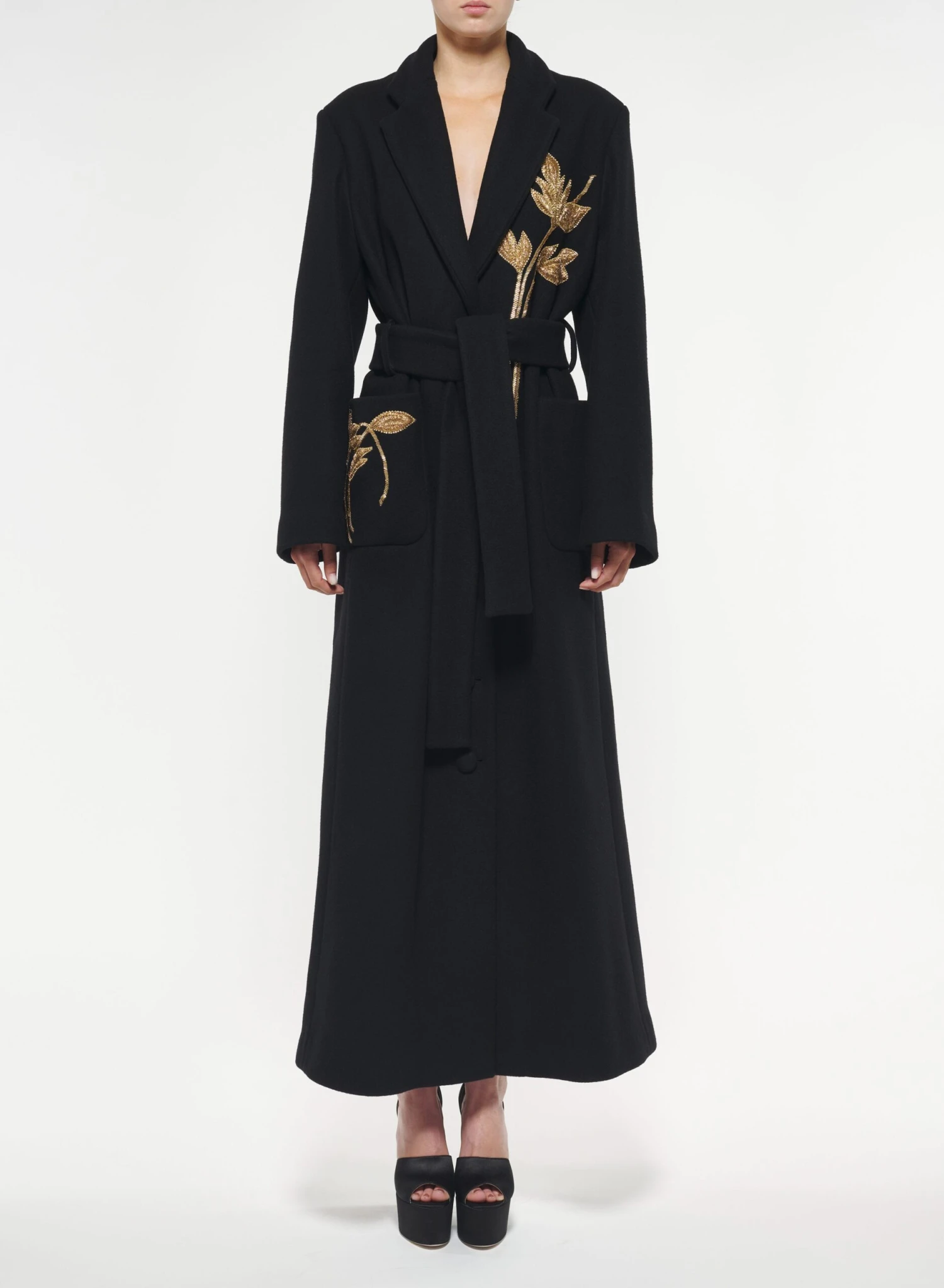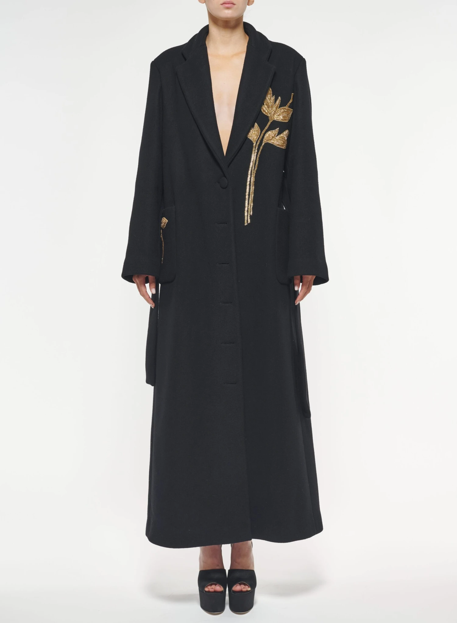 Embroidered foliage blossoms across this cashmere wool coat with a tailored lapel, bringing a touch of gold to a black silhouette.