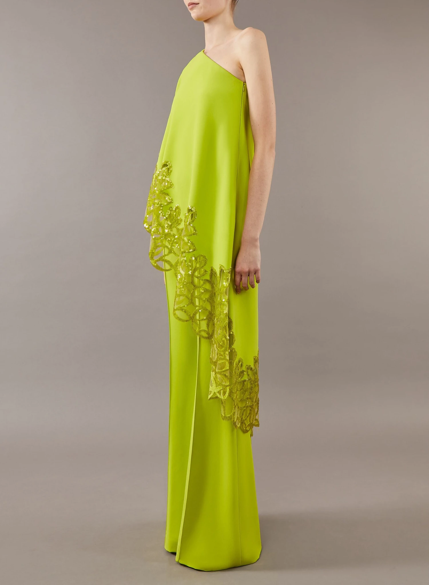 This A-symmetric wide-legged jumpsuit is made even more vibrant in lime crepe cady. Monogram embroidered details along the hemline of the diagonal, one-shoulder top, enhance the bold cape-like effect.