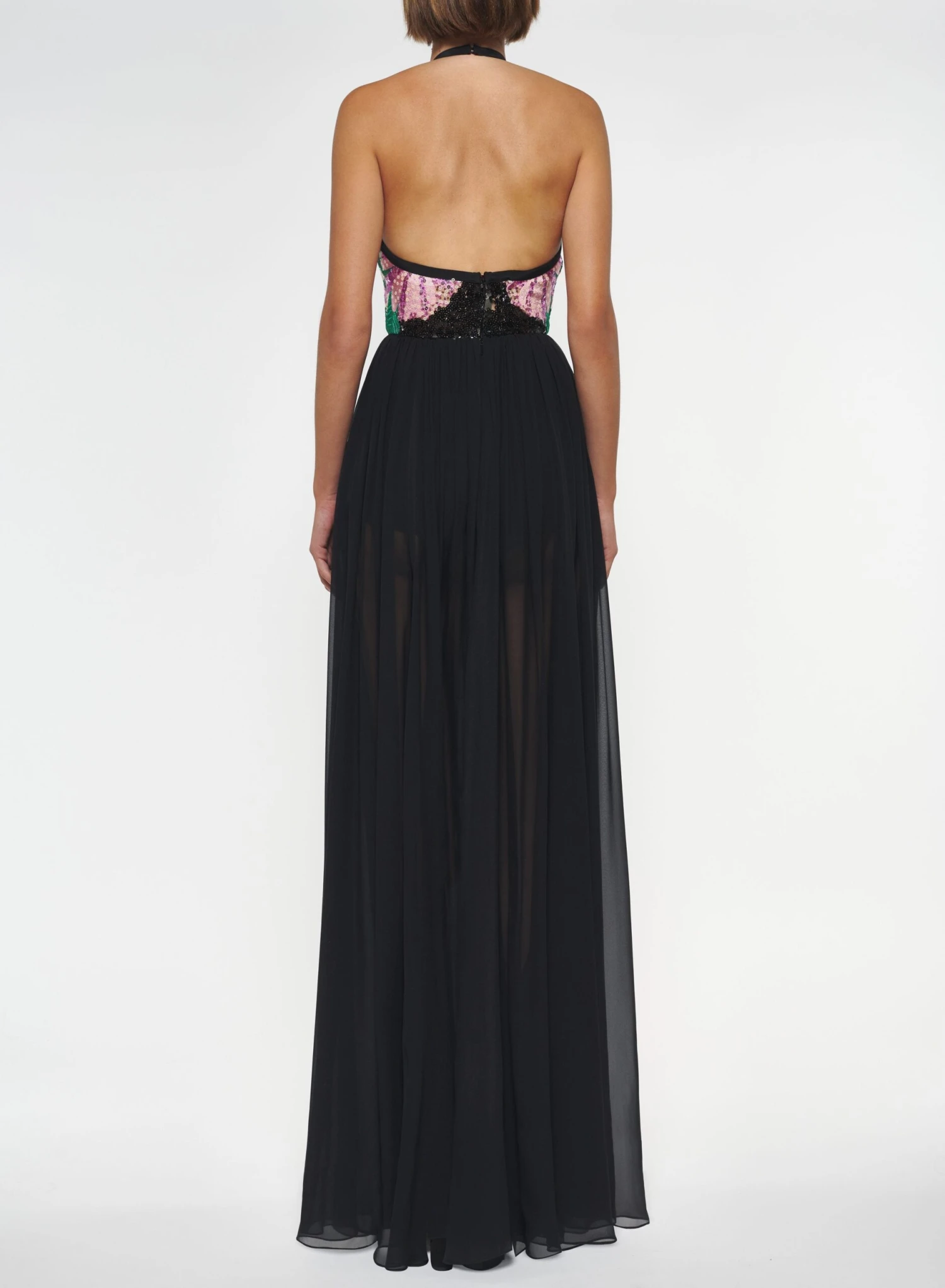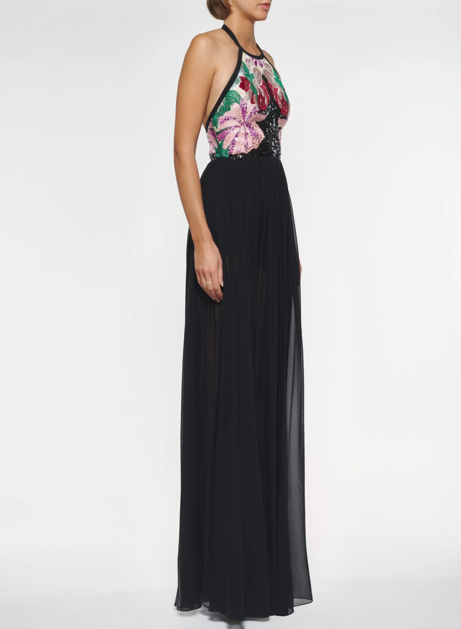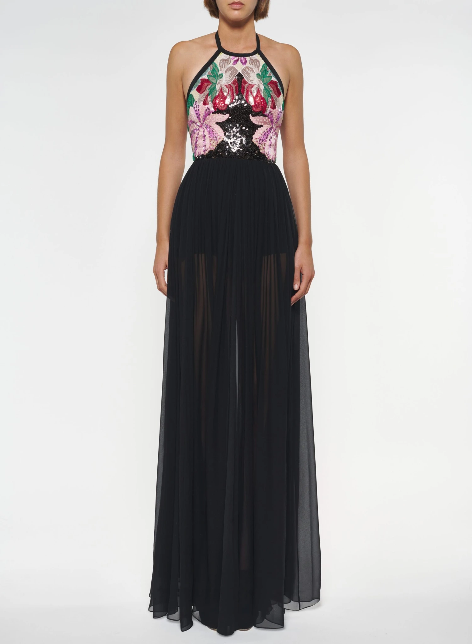 Bold multicolor sequin flowers burst across the bustier of this long halter neck dress. A demi open back and flowing black tulle skirt accentuate the feminine silhouette.